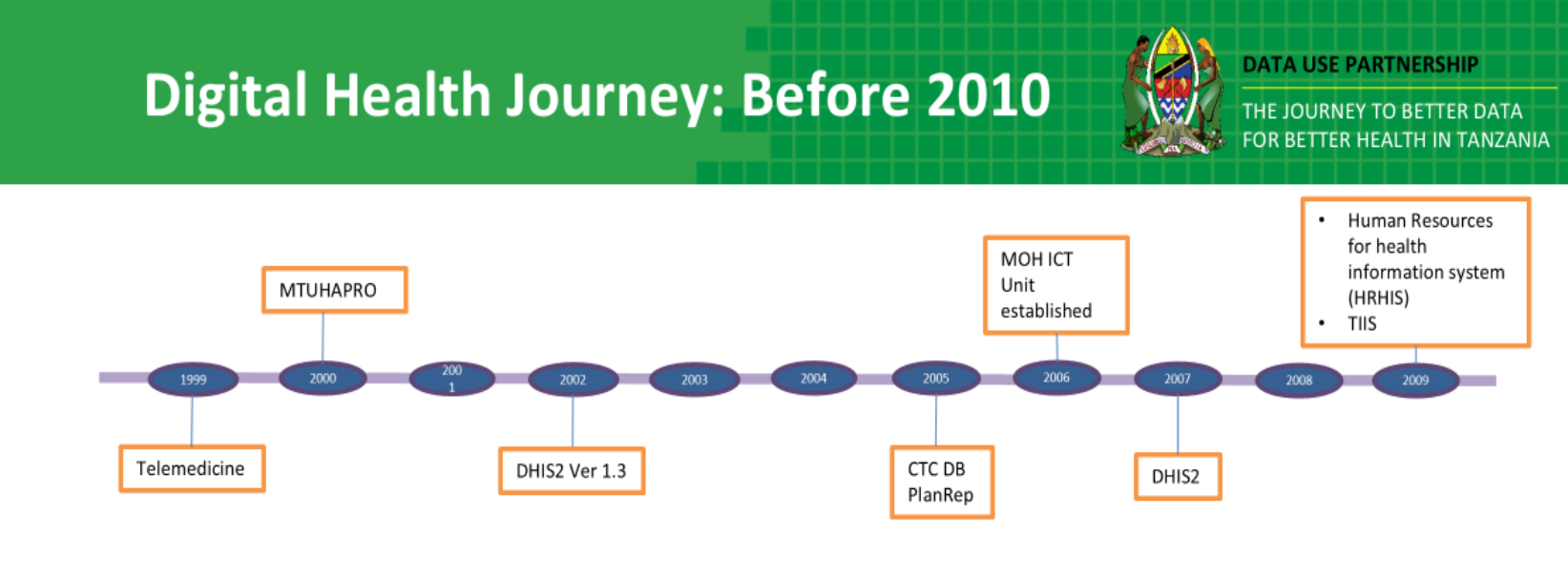 The period before 2010 was largely characterized by efforts to digitalize information collation with the introduction of District Health Information System 2 (DHIS2) and Care and Treatment Card (CTC) database for HIV. It was the period during which the government established ICT units within MOH as a dedicated section to oversee the introduction of electronic systems within the ministry and across the sector.